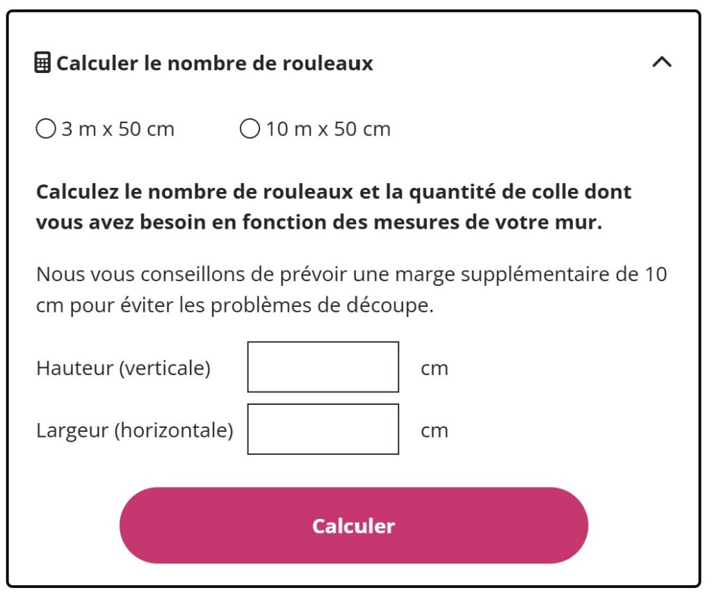 La calculatrice vous indique combien de rouleaux vous devez commander pour recouvrir toute la surface, avec marge incluse