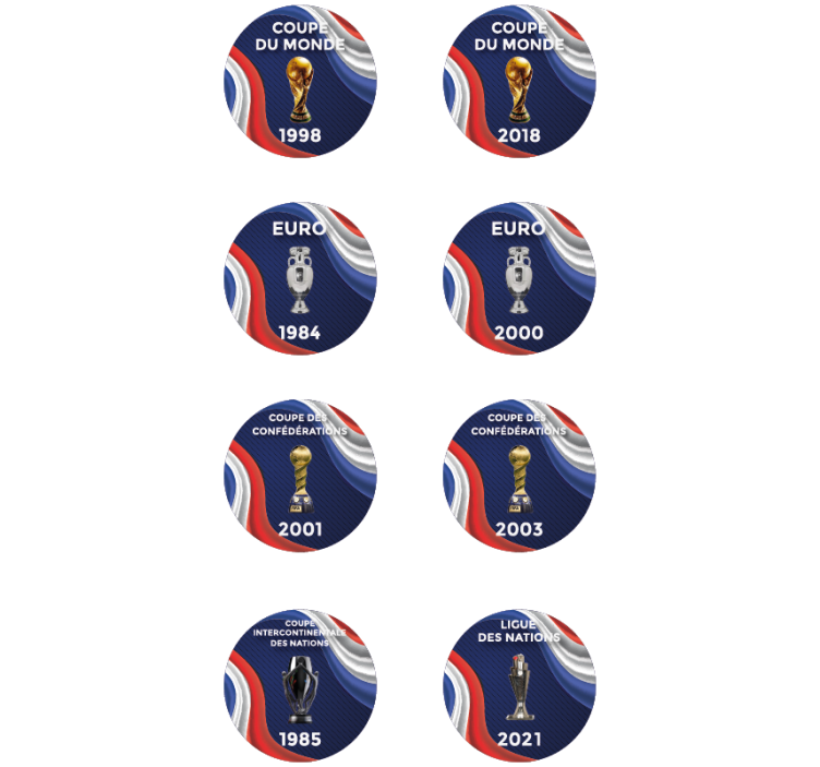 Ces sous-verres coupes équipe de france foot sont pratiques et décoratifs à la fois ! Créés pour nos supporters des Bleus, ils sont parfaits pour protéger votre table, chaque sous-verre représente la date et le trophée obtenu lors des différentes coupes ! D'une haute qualité, l'impression est de haute résolution et de couleurs intenses, un article anti-dérapant idéal pour les maladroits ! Simple à nettoyer avec un chiffon humide, vous pourrez vous en servir autant que vous voulez ! Sélectionnez le nombre de 8 ou 16 unités pour recevoir la collection complète ! La Coupe du Monde approche, commandez vos sous verres pvc trophées football !