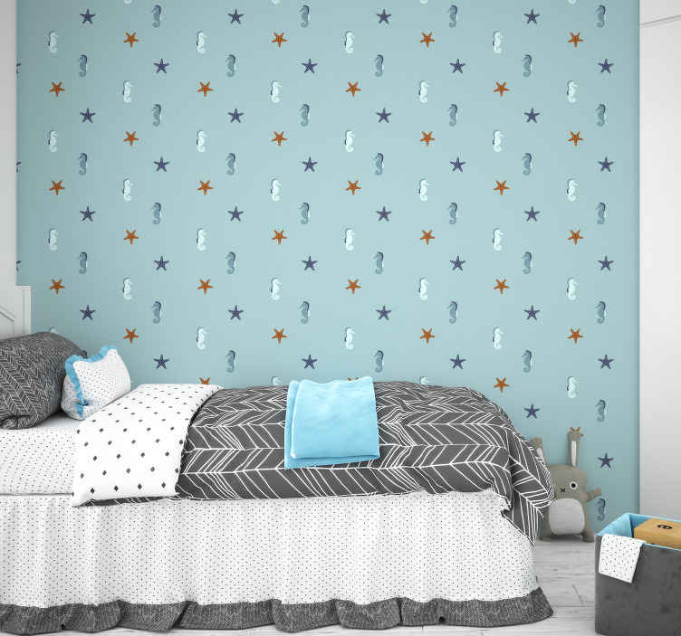 Le papier peint enfant hippocampes et étoiles de mer présente un design graphique captivant mettant en vedette des éléments marins tels que l'étoile de mer, les hippocampes et d'autres créatures de la mer. Ce motif coloré et ludique apportera une touche de magie à la chambre de votre enfant !