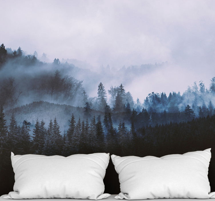 Plongez dans un univers enchanteur avec notre Papier peint forêt paysage de conifères brumeux. Ce motif captivant met en scène des arbres majestueux, des montagnes lointaines et un brouillard doux enveloppant des pins à feuilles persistantes, créant ainsi un paysage mystique qui transforme votre intérieur en un havre de paix.