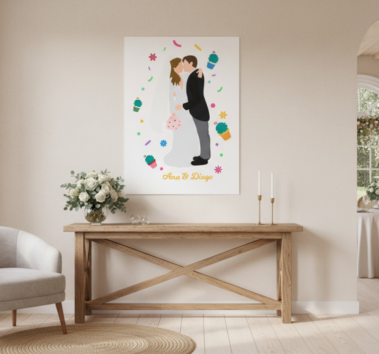Référence: G1086Découvrez notre affiche festivités et événements mariages "santo antónio", un véritable chef-d'œuvre visuel qui capture l'essence des célébrations. Ce design coloré et joyeux, rempli de motifs vibrants, évoque la magie des fêtes. Parfait pour apporter une touche festive à votre décoration, il séduira tous vos invités et illuminera vos moments spéciaux.
