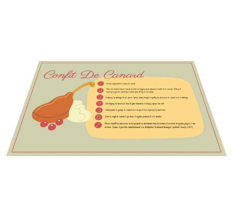 Protéger sa table quand on aime bien manger, c'est important ! Alors voici pour vous un superbe Set de table rectangulaire confit de canard recette ! Pratique et efficace, cet objet permet d'éviter de tacher votre table ou votre îlot centrale lorsque vous dégustez vos bons petits plats, tout en apportant une touche décorative ! On aime vous faire plaisir alors on vous aide avec la partie déco de votre maison, mais on est désolés de vous apprendre qu'on ne sera pas là pour vous aider à faire la recette… Tant pis ! Profitez de ce Set de table recette confit de canard, avec sa matière antitaches facile à nettoyer à l'aide d'une éponge ou d'un chiffon humide !