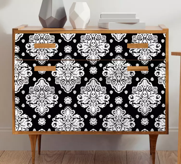 Transformez votre intérieur avec notre Adhésif meuble motif élégant superposé, un véritable chef-d'œuvre de design. Ce motif unique mélange habilement des éléments de meubles, des crânes, des fleurs et un impressionnant motif damassé dans un style moderne. Le noir et blanc s'entrelace avec des motifs ornés, apportant une touche florale qui rehausse l'esthétique de votre maison.