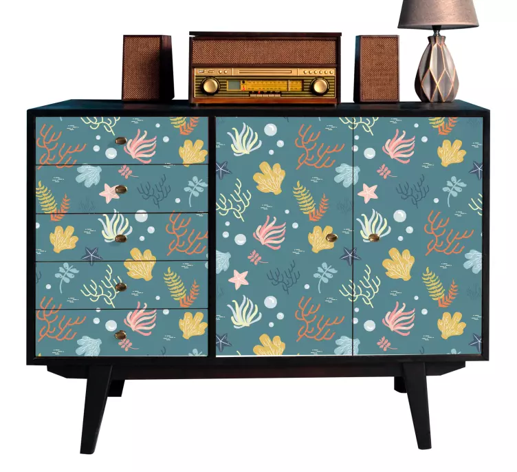 Plongez dans un univers sous-marin captivant avec notre Adhésif meuble motif récif corallien. Ce design vibrant évoque la beauté de la vie marine avec des coraux colorés des étoiles de mer et des bulles qui dansent à la surface. Transformez vos meubles en véritables œuvres d'art inspirées de l'océan, apportant une touche fraîche et vivante à votre décoration intérieure.
