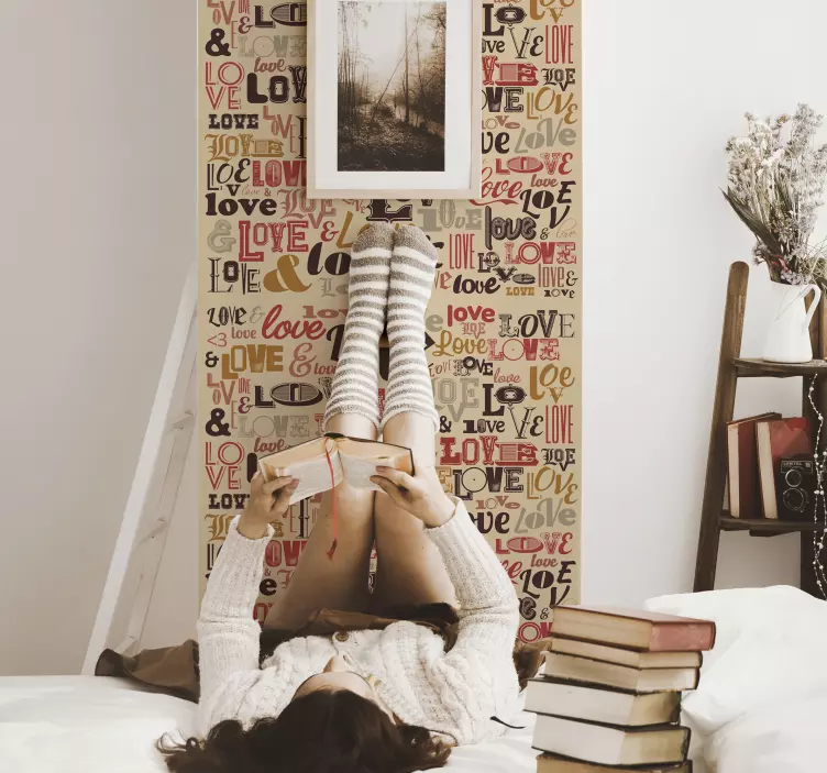 Référence: A44817Une composition vibrante mettant en avant diverses expressions de l'amour dans différentes polices et styles. La palette de couleurs chaudes combine des rouges et des tons terreux, créant une atmosphère chaleureuse et accueillante, parfaite pour enrichir les espaces émotionnels.