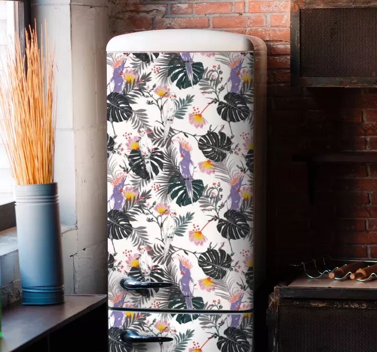 Apportez une touche de nature à votre intérieur avec notre Sticker animaux de la ferme imprimé floral tropical ! Ce modèle vibrant met en avant des feuilles luxuriantes, des perroquets colorés, et des cacatoès enjoués. Idéal pour égayer votre réfrigérateur ou frigo, ce design évoque la verdure tropicale, entouré d'oiseaux exotiques, apportant une ambiance joyeuse et chaleureuse à votre espace.