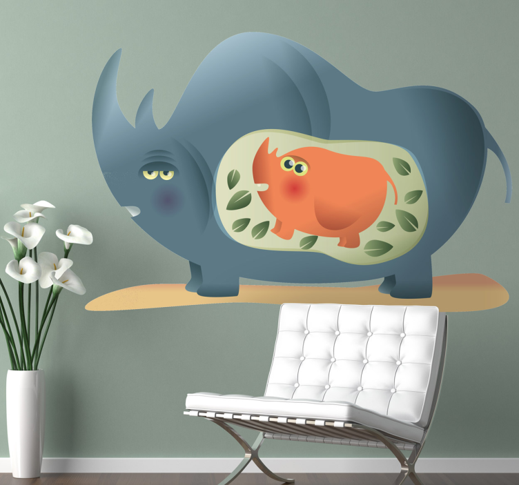 Découvrez notre Sticker animaux sauvages illustration animale ludique, une œuvre fascinante qui attire l'attention avec ses motifs vibrants. Ce design espiègle met en avant un adorable baby rhinocéros et sa maman, entourés de feuilles colorées dans un style de dessin animé capricieux. Chaque détail est soigneusement conçu pour apporter une touche ludique à votre espace.