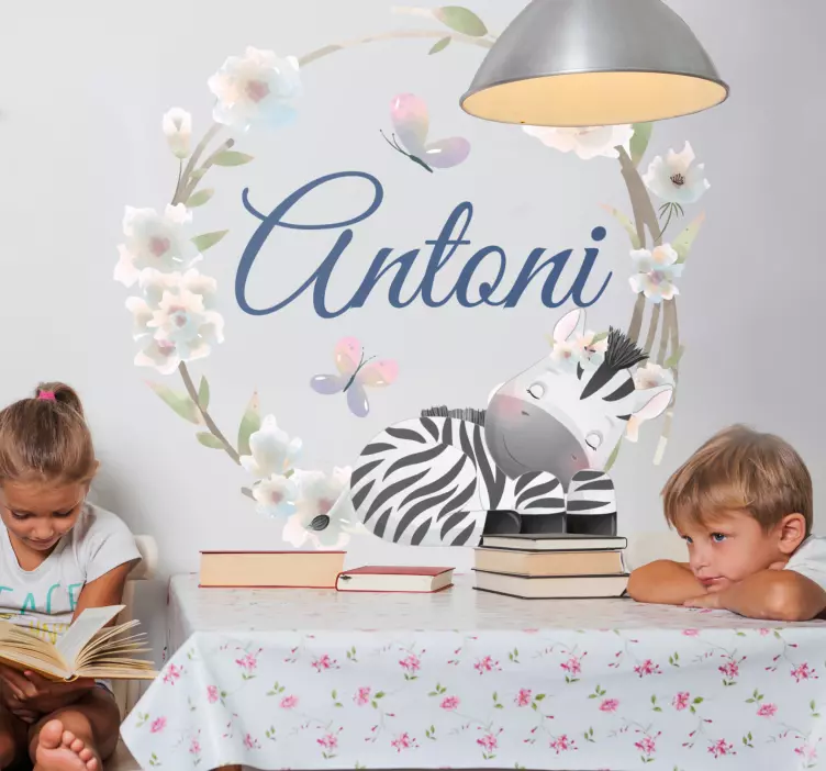 Référence: A49681Une composition florale charmante mettant en scène un zebra ludique, entouré de délicates fleurs et de papillons. Le design invite à une touche féerique, parfait pour les espaces dédiés aux enfants. Avec des options de personnalisation disponibles, il ajoute une touche personnelle, en faisant un choix idéal pour les crèches ou les salles de jeux.