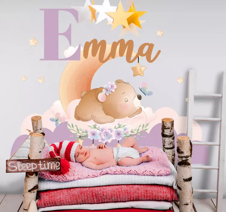 Référence: A52394Une représentation charmante d'un ours endormi blotti parmi des nuages et des étoiles. Le design inclut des couleurs pastel, des accents floraux et des éléments personnalisés, idéal pour l'espace d'un enfant. Le thème serein favorise la tranquillité, le rendant parfait pour les crèches ou les chambres d'enfants.