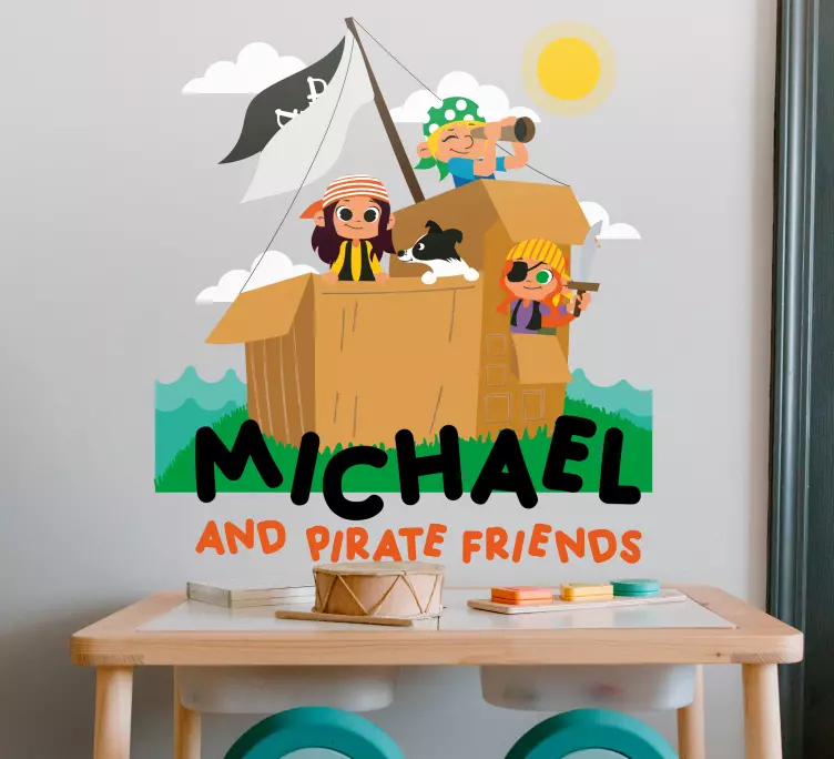 Référence: A48764Une scène vibrante mettant en scène des enfants déguisés en pirates à bord d'un bateau en carton, avec une voile et un chien espiègle. Le design capture l'essence de l'imagination et de l'aventure enfantines, parfait pour créer une atmosphère ludique dans l'espace d'un enfant.