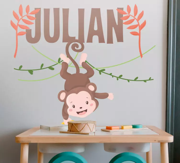 Référence: A49357Un design charmant mettant en scène un petit singe suspendu la tête en bas à une liane. Le design inclut des feuilles vibrantes et une option de personnalisation, le rendant parfait pour les espaces destinés aux enfants. L'expression espiègle du singe ajoute une touche joyeuse à tout environnement.