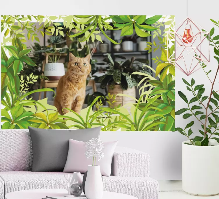 Référence: A48313Une scène charmante mettant en vedette un chat attentif entouré d'une verdure luxuriante. Le design capture l'essence de la nature mêlée au confort domestique, mettant en avant le comportement curieux du chat au milieu d'une variété de plantes d'intérieur.