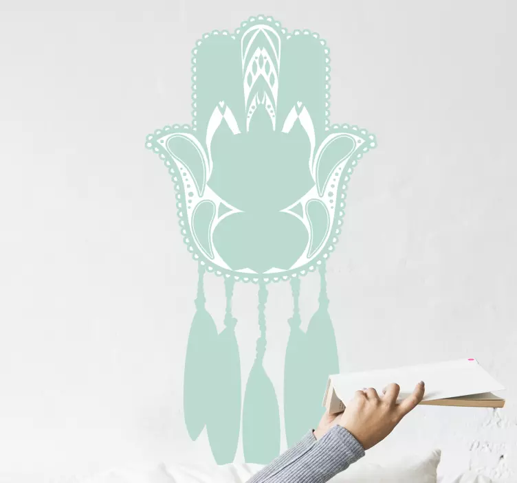 Découvrez notre Sticker déco emblème botanique gracieux, une œuvre d'art qui fusionne élégance et nature. Avec son motif attrapeur de rêves agrémenté de mains et de fleurs, ce design turquoise et artistique apportera une touche de magie à votre intérieur. Laissez-vous séduire par cette pièce unique qui embellira votre espace avec style !