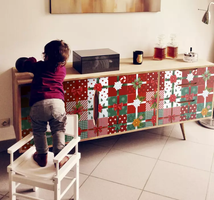 Découvrez notre magnifique Sticker événement emballage cadeau festif qui apporte une touche de magie à vos célébrations ! Avec son motif inspiré des meubles, cadeaux, et l'esprit de Noël, ce design en rouge et vert se compose de carrés élégants et de nœuds décoratifs, parfait pour embellir vos enveloppes cadeaux ou vos décorations de fête. La présentation est à la fois festive et joyeuse, captivant l'essence même de cette période de l'année.