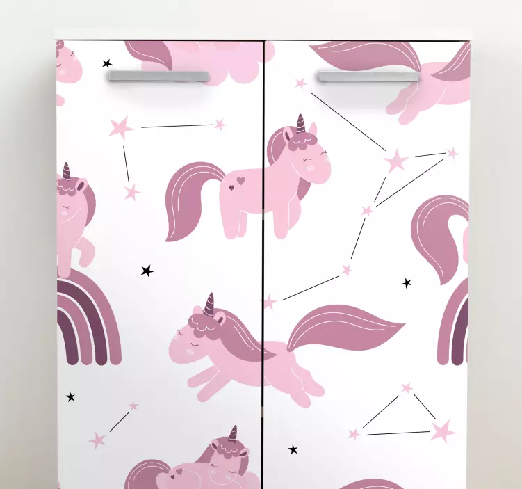 Transformez votre décoration intérieure avec notre Adhésif meuble motif licorne rose ! Avec ses adorables licornes, son design fantaisie, et ses nuances rose et arc-en-ciel, ce modèle mignon illuminera chaque garde-robe et meuble de la chambre de vos enfants. Les constellations et étoiles ajoutent une touche magique, créant un univers féerique qui ravira petits et grands.