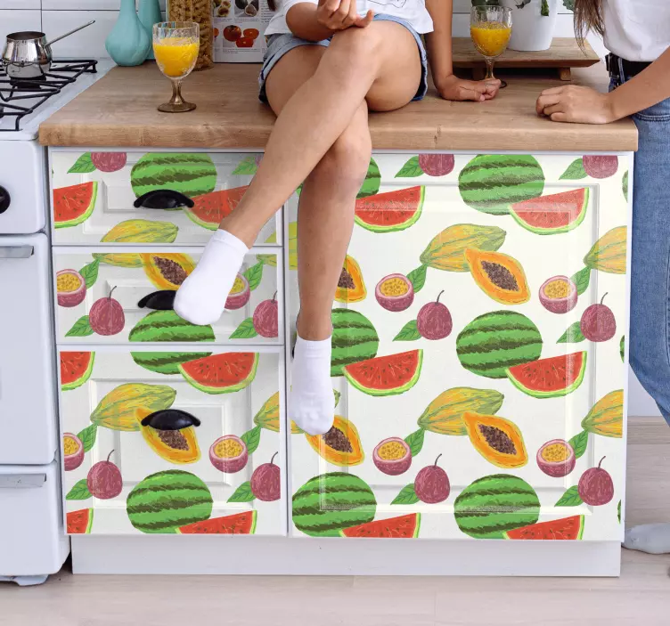 Apportez une touche de fraîcheur et de joie à votre espace avec notre Sticker fruit création motif fruit. Ce design coloré et tropical, mettant en avant des pastèques, des papayes et des citrons, transforme vos meubles et vos murs en une véritable fête visuelle. Chaque motif est soigneusement conçu pour évoquer une ambiance estivale et vivante, idéale pour égayer votre intérieur.