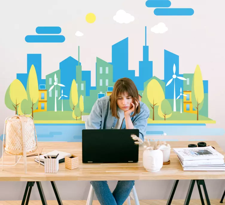 Découvrez notre Sticker monde paysage urbain moderne, une illustration captivante qui capture l'essence d'une ville dynamique. Avec ses silhouettes de grattes ciels, ses bâtiments majestueux, et une touche de nature avec des arbres, l'eau et des éoliennes, ce design est un véritable tableau de vie urbaine sous le soleil.