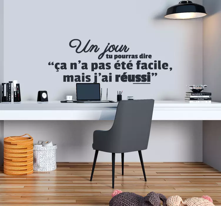Référence: A39376Le Sticker motivation succès J'ai Réussi est un produit graphiquement inspirant, conçu pour apporter une touche de motivation à n'importe quel espace. La phrase de motivation en français 'j'ai réussi' est parfaite pour rappeler le succès et la détermination. Ce produit est idéal pour décorer un bureau, une chambre ou tout autre endroit où l'inspiration est nécessaire.