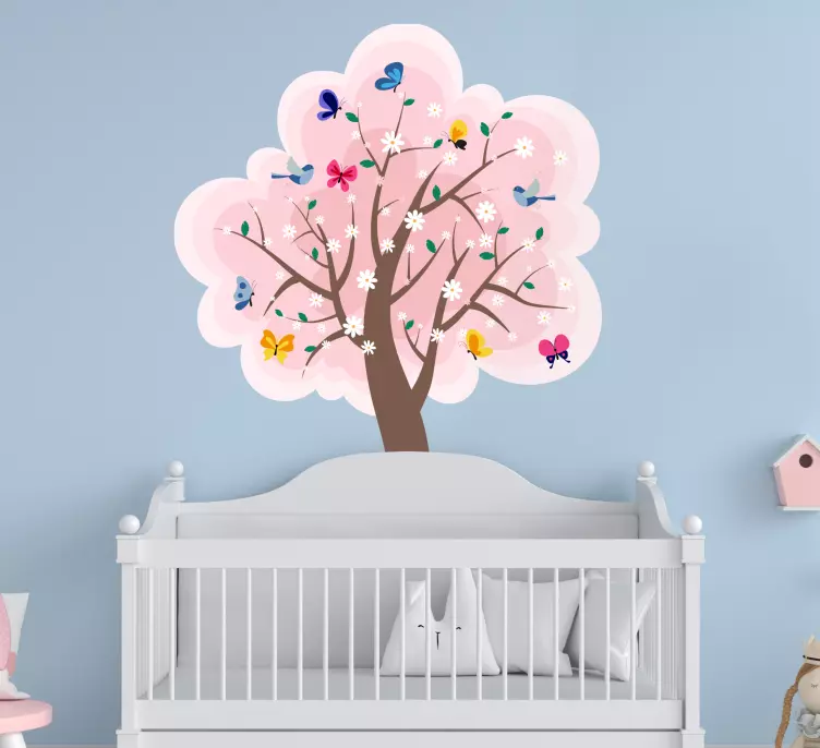Apportez une touche de vie à votre intérieur avec notre Sticker nature scène d'arbre en fleurs. Cette illustration vibrante met en avant un arbre majestueux en fleurs, entouré de délicats papillons. Les couleurs éclatantes de la nature, avec des nuances de rose, évoquent la beauté du printemps et égayent n'importe quelle pièce.