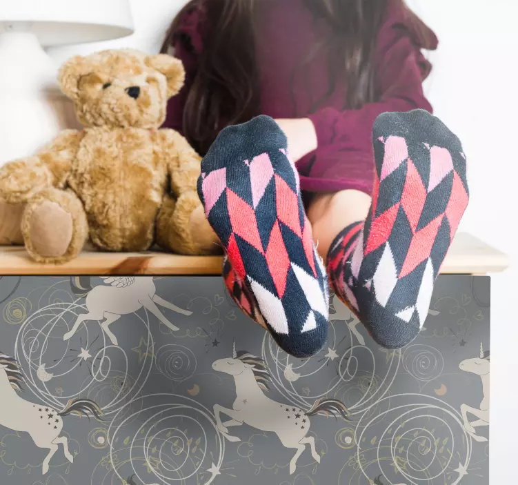 Plongez dans un univers féerique avec notre Adhésif meuble motif de licorne enchanteur. Ce modèle captivant met en valeur des licornes et Pégases qui tourbillonnent sur un fond gris, transformant vos meubles en véritables œuvres d'art. Avec ses créatures mythiques, ce design magique et capricieux apportera une touche de fantaisie à la chambre de vos enfants.