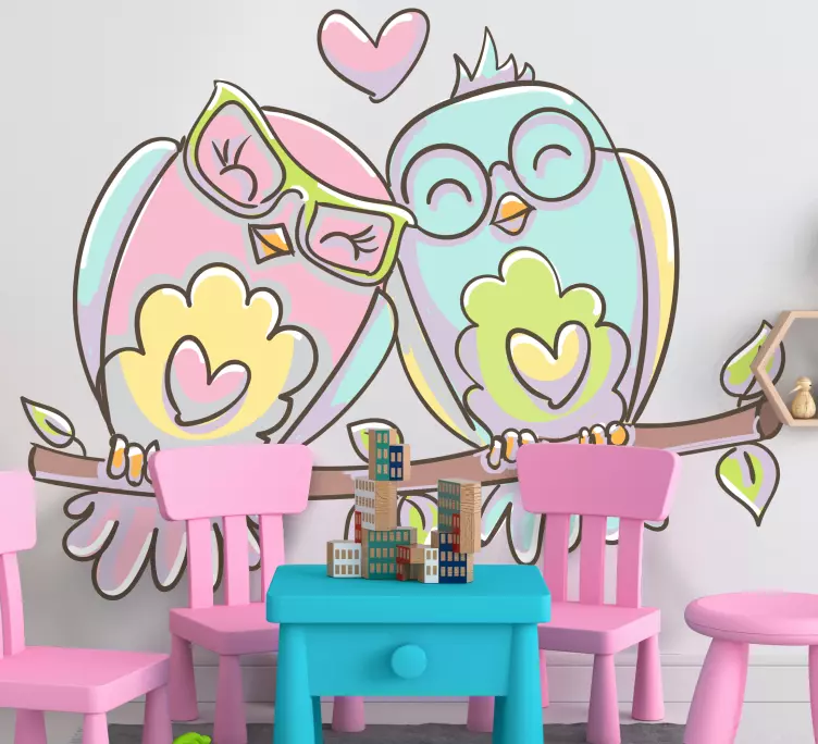Découvrez notre magnifique Sticker oiseaux oiseaux d'amour adorables, une illustration pleine de charme qui met en avant des hiboux et des chouettes mignons. Les couleurs rose et bleu apportent une touche joyeuse et chaleureuse à votre décoration. Ces oiseaux heureux, en couple et amoureux, égayeront n'importe quel espace avec leur design captivant.