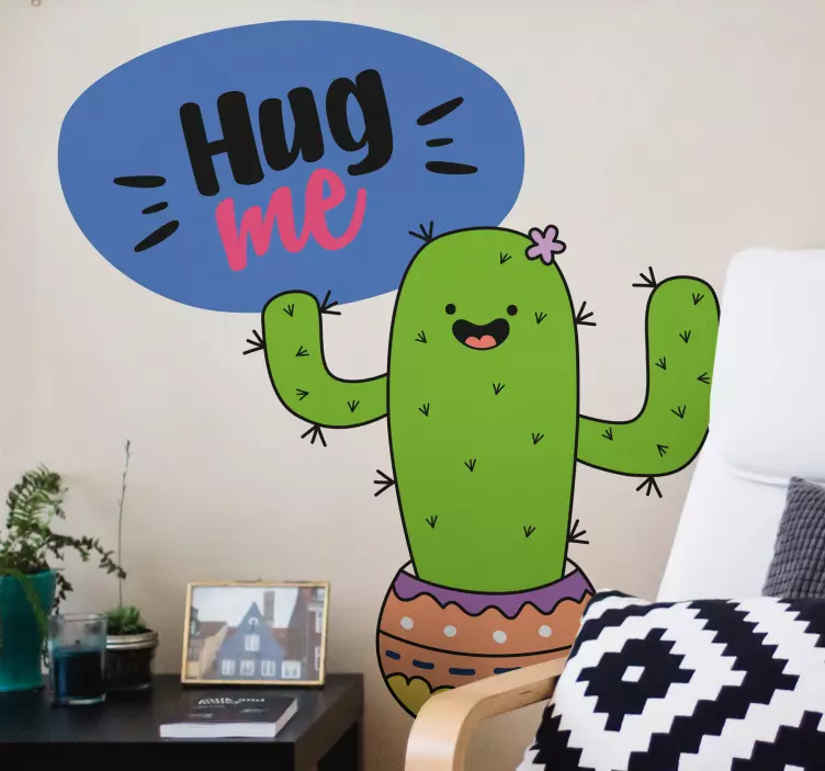 Référence: A46921Un personnage de cactus joyeux avec un sourire amical, orné d'une fleur vibrante et d'un pot coloré. Il présente une bulle de dialogue ludique avec le texte encourageant les "hugs", ajoutant une touche légère au design global.