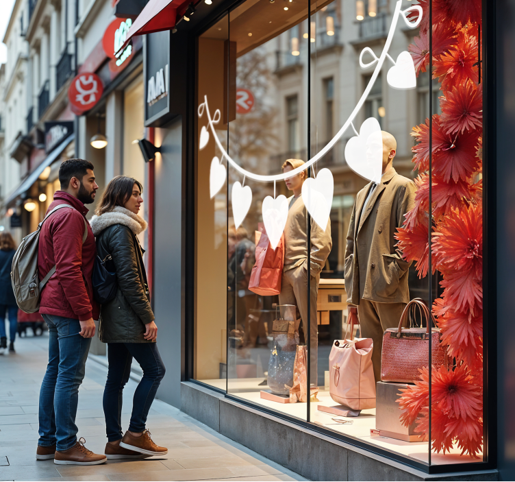 Référence: A40830Ajoutez une touche d'amour à votre décoration avec notre Sticker st valentin coeurs en demi-cercle. Ce design captivant, avec ses cœurs en pendaison, embellit toutes les vitrines pour la Saint-Valentin. Que ce soit pour célébrer la fête des amoureux ou pour égayer votre intérieur, ces stickers s'intègrent parfaitement dans votre univers décoratif !
