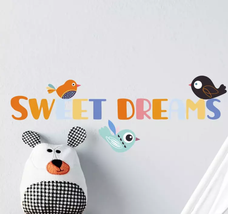 Apportez une touche de magie et de douceur à la chambre de votre enfant avec notre Sticker tête de lit phrase nocturne colorée ! Cette illustration colorée met en scène des oiseaux espiègles et des lettres vibrantes qui évoquent des rêves enchantés. Son design ludique transforme l’espace en un havre de paix où le sommeil devient une aventure. Les couleurs multicolores ajoutent une ambiance joyeuse et accueillante, parfaite pour stimuler l'imagination des petits.