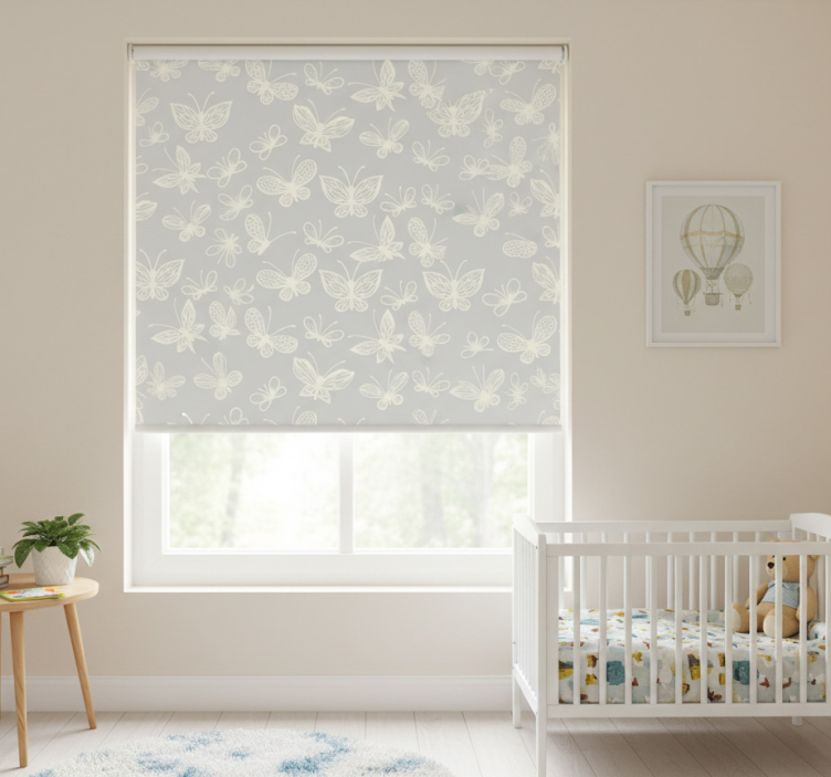 Store enrouleur chambre enfant motif papillons gris et blanc