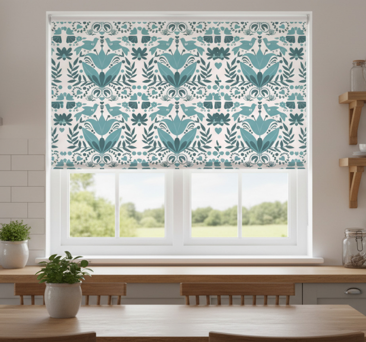 Store enrouleur cuisine motif folk bleu avec oiseaux