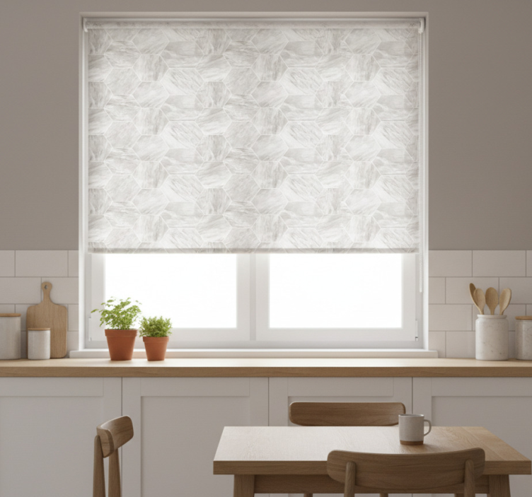 Store enrouleur cuisine motif hexagonal marbre doré
