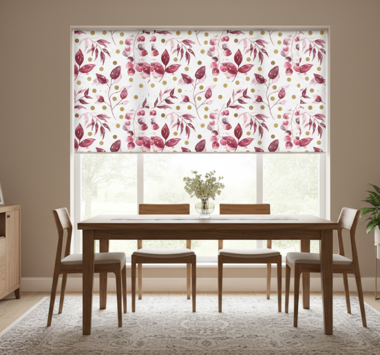 Store enrouleur salle à manger feuilles bordeaux à pois dorés