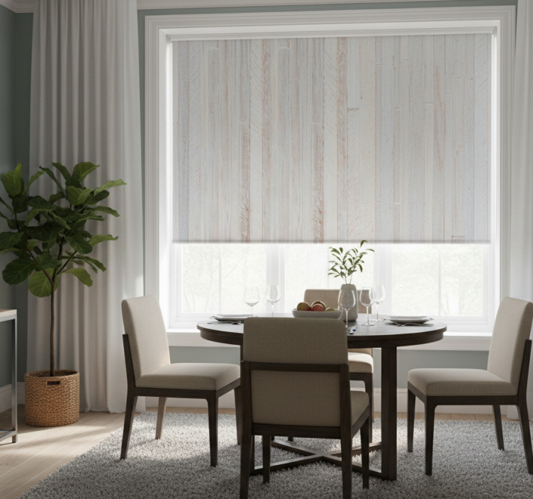 Store enrouleur salle à manger motif bois gris élégant