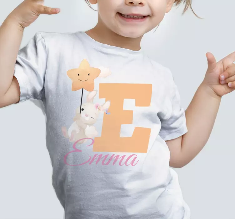 Référence: T4701Ce design charmant présente un joyeux lapin tenant un ballon en forme d'étoile, accompagné de la lettre 'E' et d'un nom personnalisé. Parfait pour les occasions spéciales, il rayonne de joie et de fantaisie, ce qui en fait un choix idéal pour les petits.