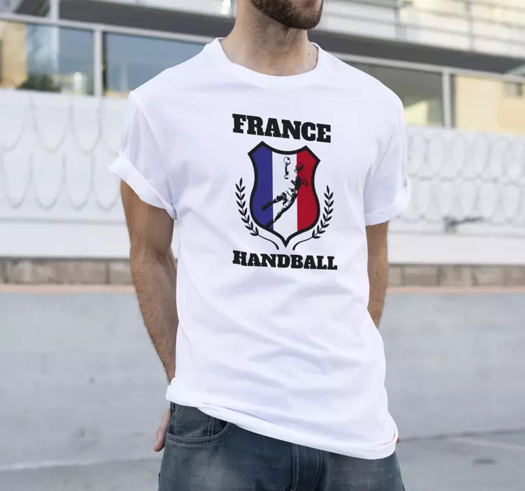 Nous vous présentons un t-shirt sur le thème du handball français. Il est classique, à manches courtes et blanc. De plus, il incarne le symbole français du handball.