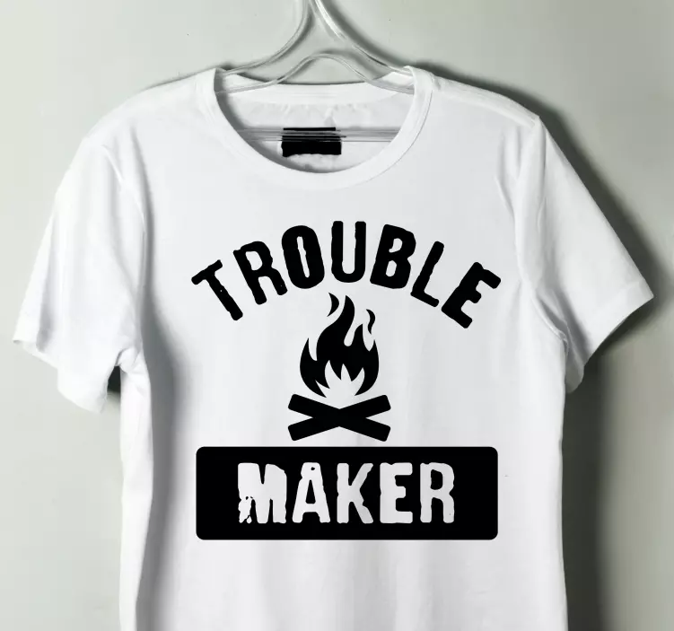 Référence: T5448Ce design accrocheur présente un texte audacieux portant la mention 'Trouble Maker', accompagné de symboles de flamme et de feu de camp. Il est parfait pour ceux qui embrassent un esprit amusant et aventureux. Le contraste entre le noir et le blanc ajoute une touche d'excitation et attire l'attention sans effort.