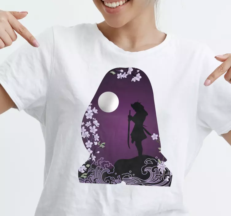 Référence: T4771Cette pièce élégante présente la silhouette d'un guerrier au milieu de fleurs de cerisier et d'une lune sur un fond violet vibrant. Les éléments floraux ajoutent une touche d'élégance, la rendant parfaite pour les individus expressifs qui apprécient l'art dans leur garde-robe.