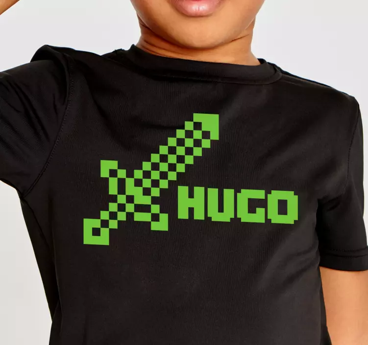 Référence: T4921Cette pièce vibrante présente un design d'épée pixelisée accompagné d'un nom personnalisable. Le vert audacieux sur un fond noir élégant crée un attrait visuel saisissant, parfait pour les jeunes passionnés de jeux vidéo. C'est un ajout amusant et personnalisé à la garde-robe de tout enfant.