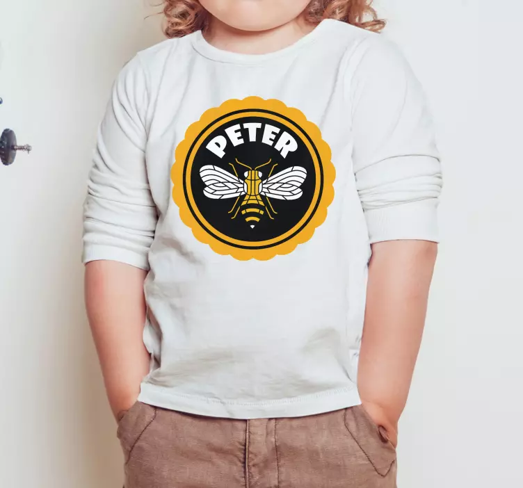Référence: T4984Ce design charmant présente une illustration vibrante d'abeille entourée d'une bordure ondulée jaune audacieuse. Le nom 'Peter' affiché en évidence ajoute une touche personnalisée, le rendant parfait pour les enfants. La combinaison de couleurs ludiques et d'un motif engageant crée un look attrayant pour les vêtements pour enfants.