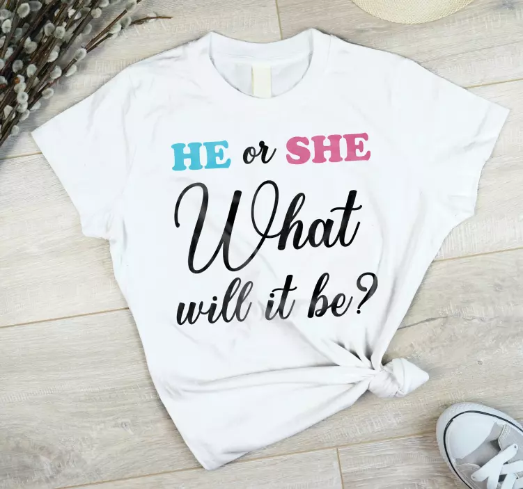 Ce vêtement accrocheur présente une question amusante sur la révélation du genre, demandant 'What will it be?' avec un texte vibrant. L'utilisation ludique des couleurs ajoute de l'excitation, le rendant parfait pour les célébrations en famille et les moments mémorables.