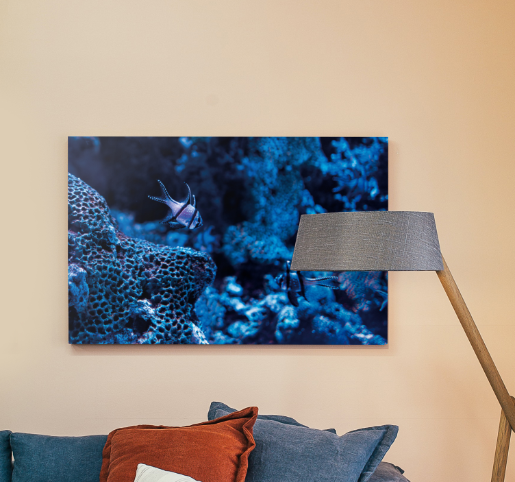 Plongez dans l'univers fascinant de la mer avec notre tableau mer poissons des récifs coralliens. Ce design vibrant évoque la beauté des récifs coralliens, où le corail s'entrelace avec les poissons multicolores, le tout dans des nuances de bleu apaisantes. Laissez-vous transporter par la vie marine qui s'anime sous vos yeux et créez une atmosphère marine dans votre intérieur !