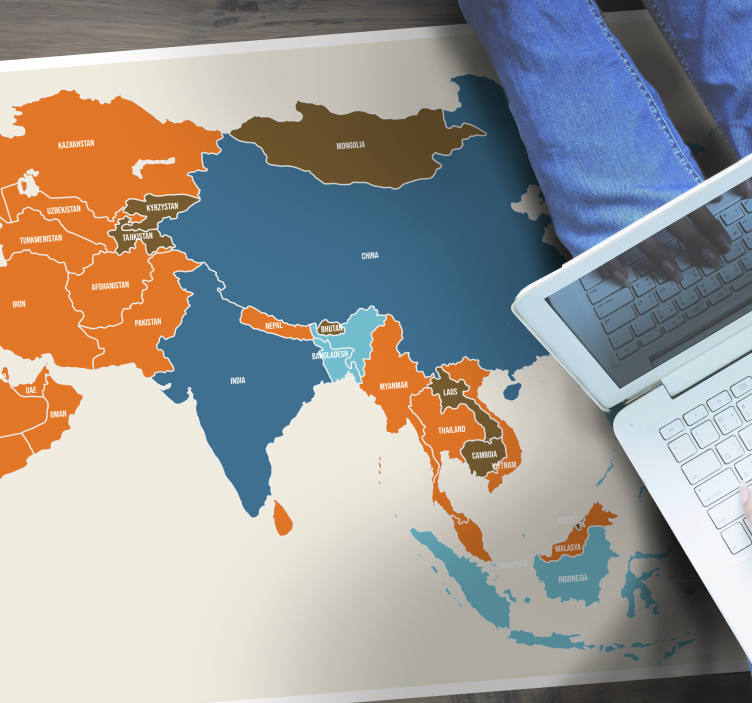 Référence: R14375Une représentation stylisée du continent asiatique avec des pays délimités dans une gamme de teintes chaudes et froides. Le contraste de couleurs facilite la distinction entre les différentes frontières géopolitiques et sert d'outil éducatif.