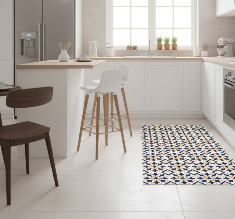 Tapis vinyle cuisine bleu avec carreaux jaunes