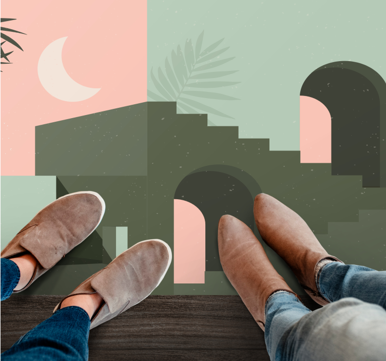 Référence: R11884Une représentation abstraite mettant en scène des silhouettes architecturales minimalistes sur un fond pastel. Le paysage comprend des formes géométriques ressemblant à des bâtiments et des arches, avec une représentation simple d'un palmier et d'un croissant de lune.